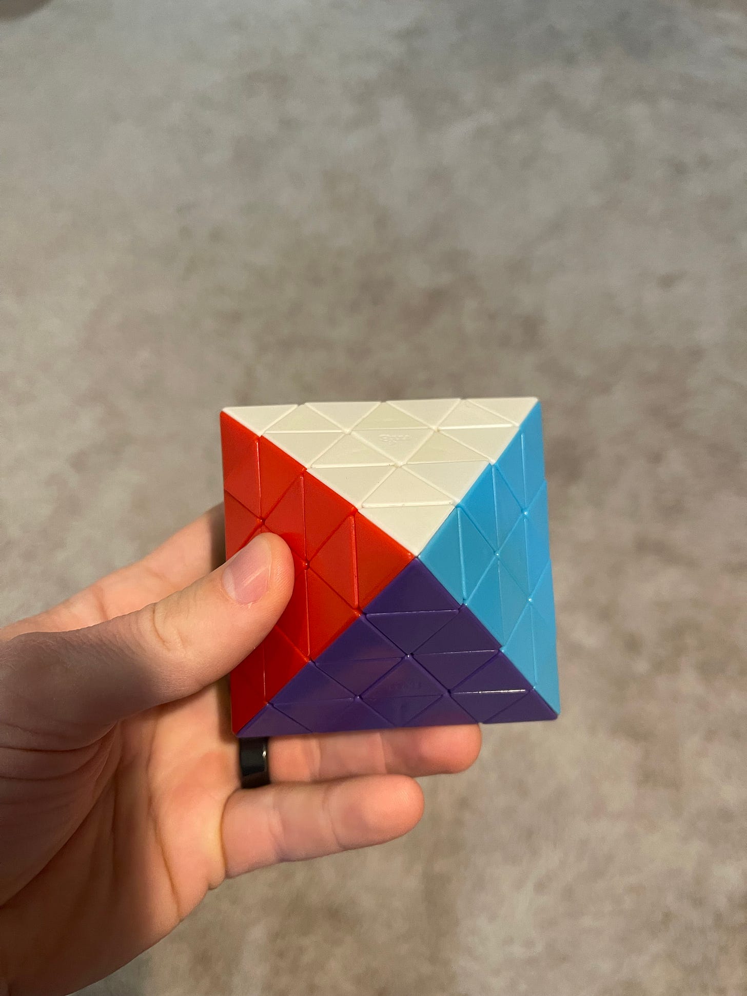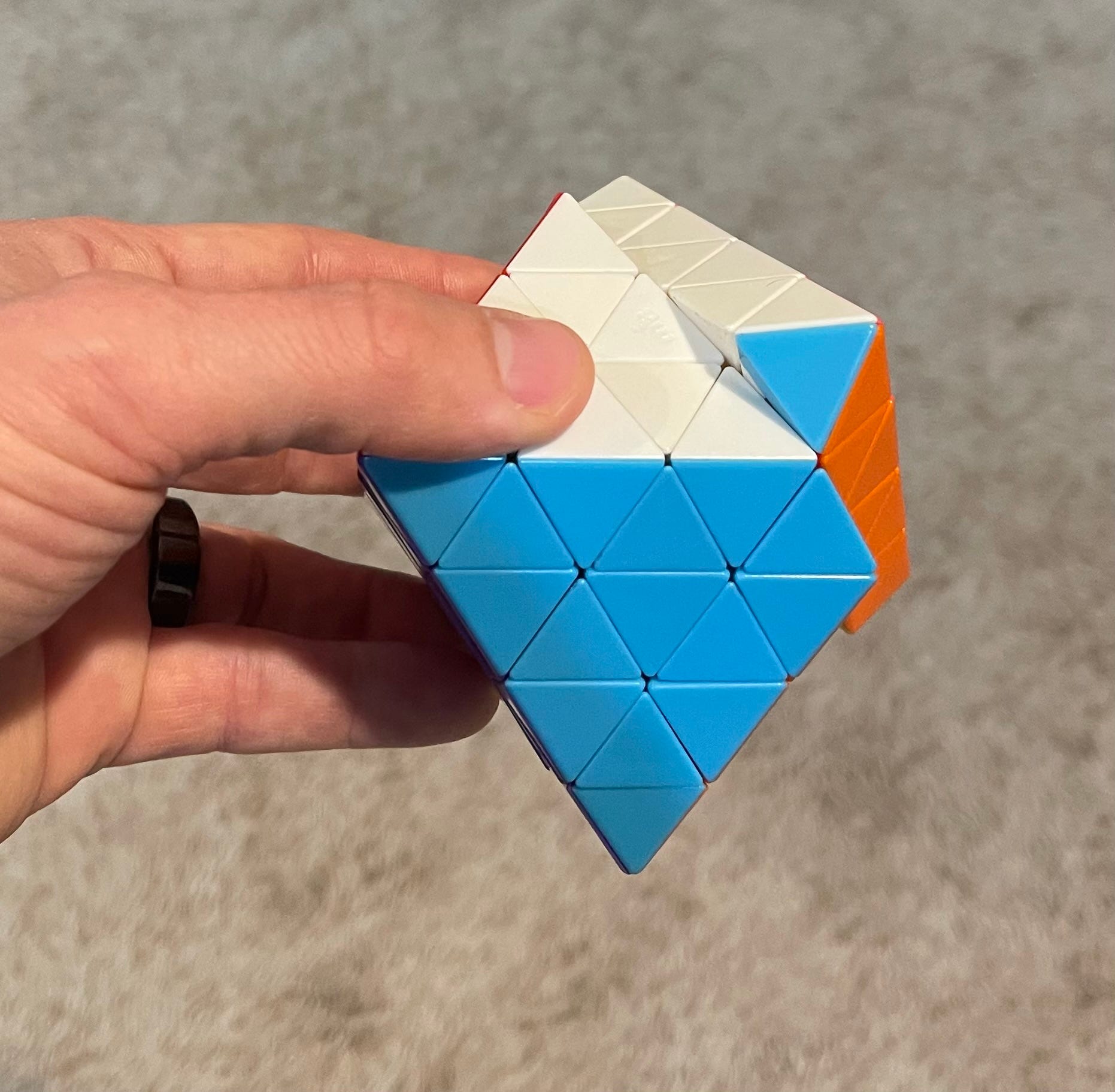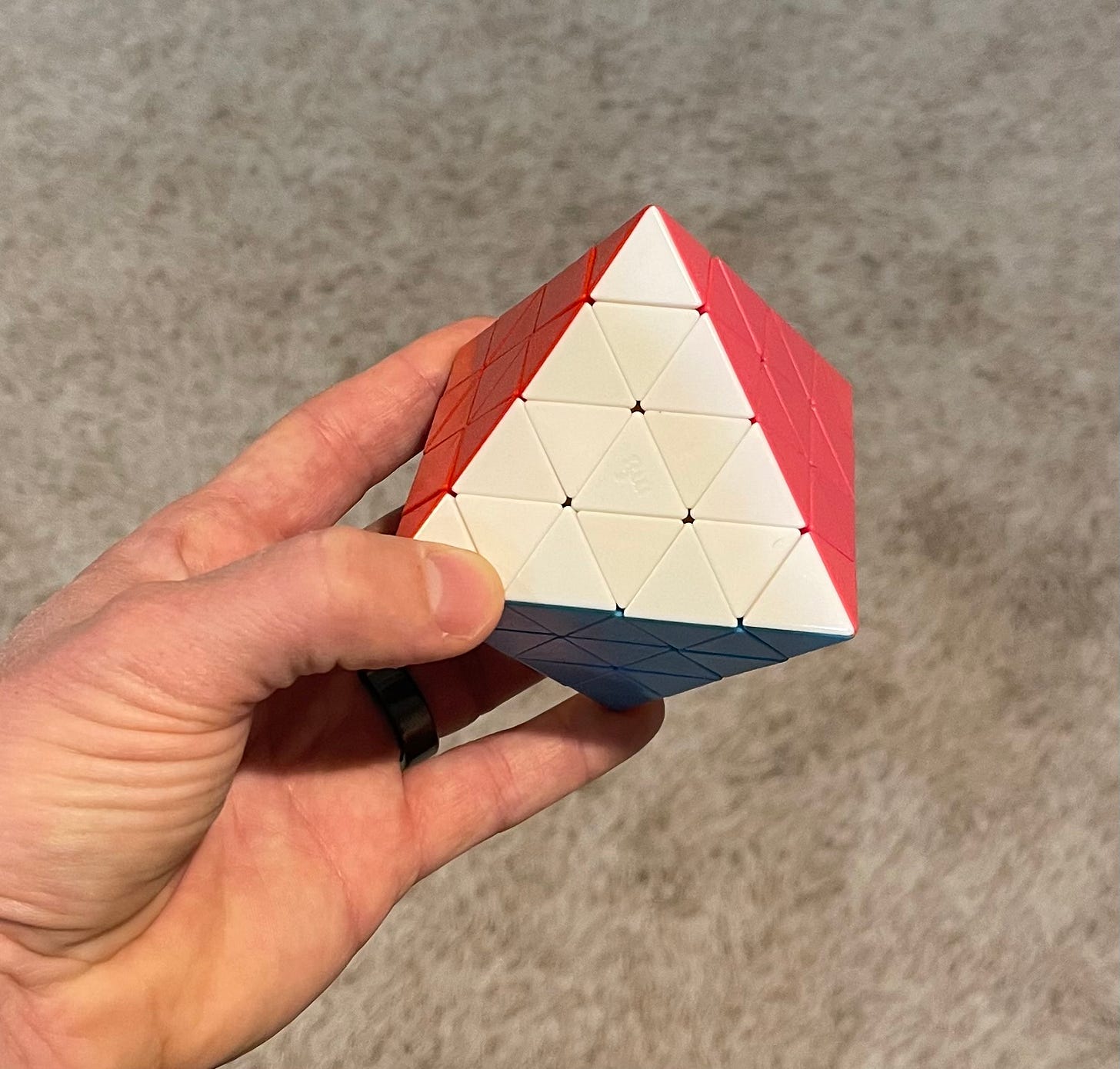 This is where you will need to be careful about doing setup moves and reversing the setup. Suppose the triangles I want to cycle are in the right position on the left and up face, but the one on the right face is not. I will need to rotate the right face (an R or R’ move), do the above algorithm, then undo the right face move. It is likely you’ll need to do multiple rotations for some of the 3-cycles in your solve, e.g. do L’ R to set the triangles in the correct position, do the algorithm above, then do R’ L. A mistake here can set you back several steps. If you are tempted to do *three* setup moves, there is usually a more efficient approach. Rotating the puzzle so a different face is on top will often expose a 3-cycle with fewer setup moves. But feel free to challenge yourself. This requirement to remember setup moves is what makes the puzzle fun and challenging. For your first few solves, it might be worth writing down the setup moves, or saying them out loud to help store them in your auditory memory. If you like this kind of challenge, I can also recommend the Earth Crazy 3x3. I understand the other planets in this puzzle series are similar.