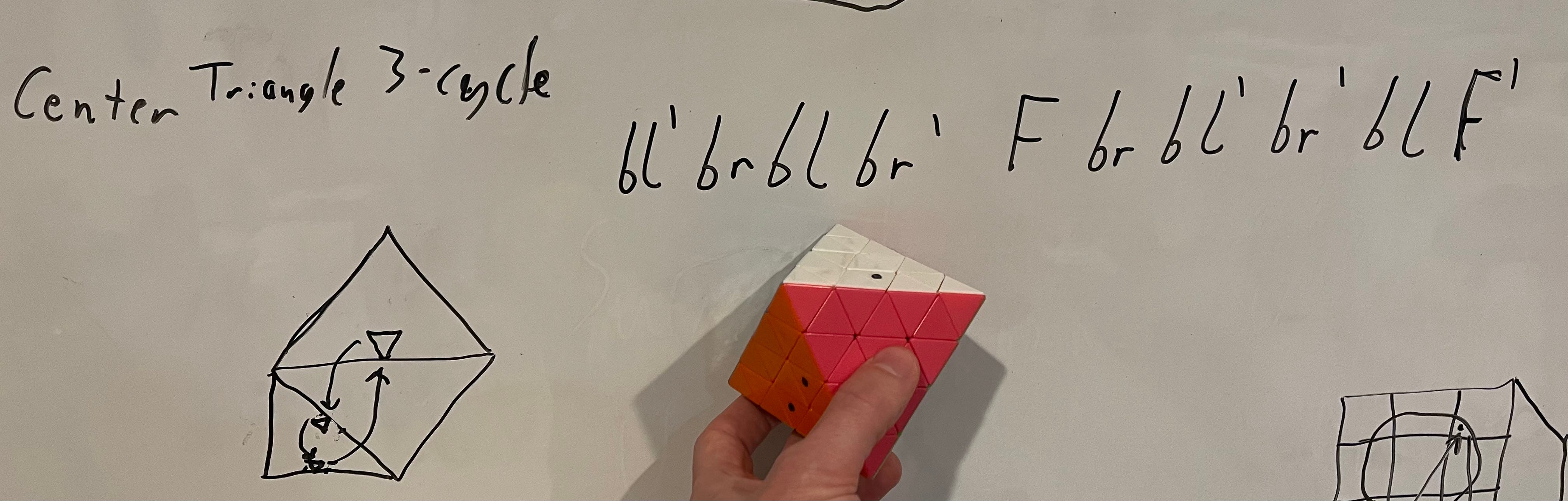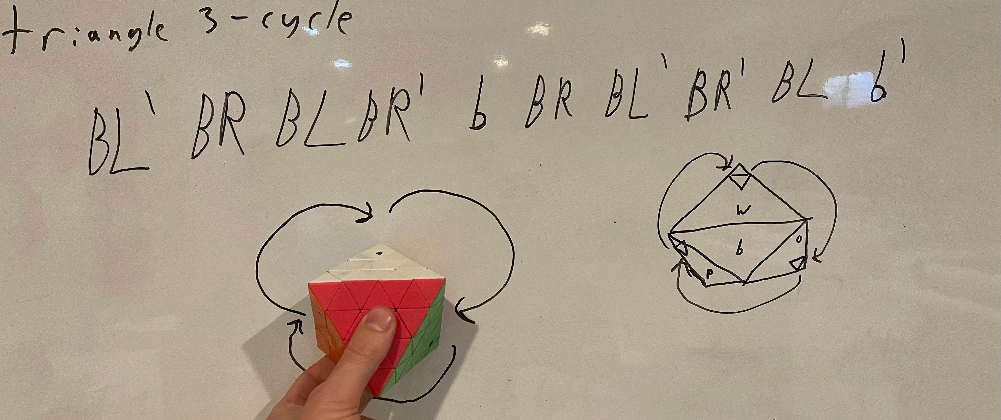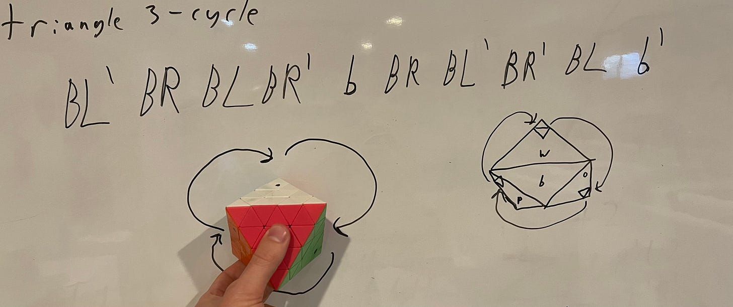 This algorithm will cycle three center-edge triangle pieces. It will be necessary for completing edges. Note the black dot on the pieces that are part of the three cycle, marked in the image below. (Remember, lower case means slice moves, ‘bl’ means the back-left, etc.). See the counter-clockwise direction of the cycle, marked on the drawing on my white board. And pardon the irrelevant drawing of a Crazy 3x3 in the lower right corner.