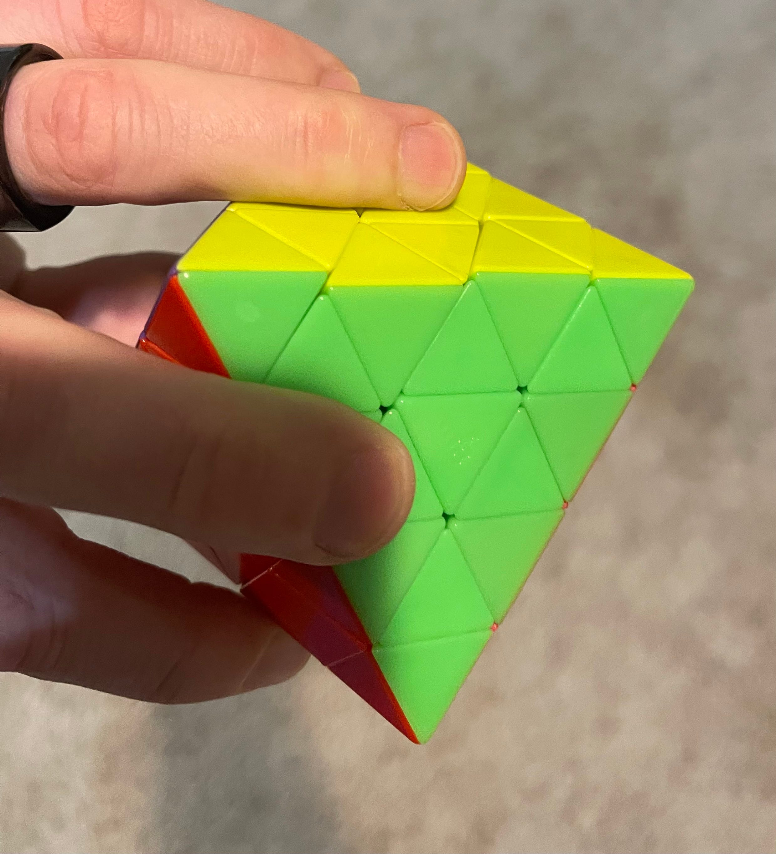 You can practice this algorithm and the center-triangle 3-cycle on a regular (3-layer) FTO. The center-edge triangle 3-cycle will move edges in the same relative positions as on a regular FTO. The corner triangle 3-cycle algorithm will move the single-color triangle pieces that are in the same relative positions. Try it and see! This is actually a fun challenge for the regular FTO. Start by correctly placing and orienting the corners, then move the edges and center “petal” pieces with the algorithms above. It is not as efficient as other methods, but it will give you useful practice for the 4-layer FTO. It also offers an efficient method for placing the final edges, as compared to the beginner method I learned. This is a classic case of a higher-order puzzle teaching you something useful and interesting about the more basic version.